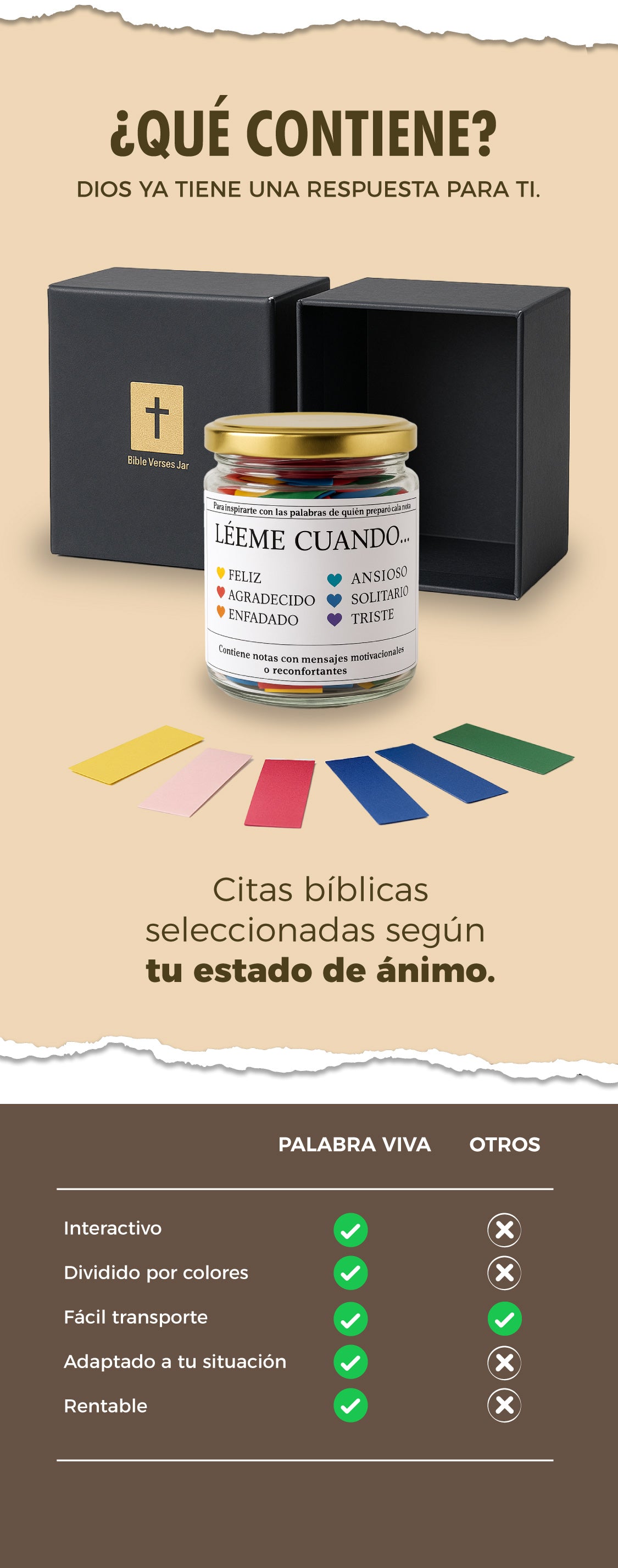 Se lo compré a mi mamá para el Día de la Madre. Estaba pasando por un momento difícil y como tiene una relación muy cercana con Dios, pensé que sería el regalo perfecto y no me equivoqué. Mientras estaba conmigo, sacamos varios versículos y los leímos juntas. Las frases son muy personales y positivas. Me gusta que tienen diferentes temas según tu emocion. Sin importar cómo te sientas, siempre encuentras un versículo que te guía. El frasco es perfectoAndrea