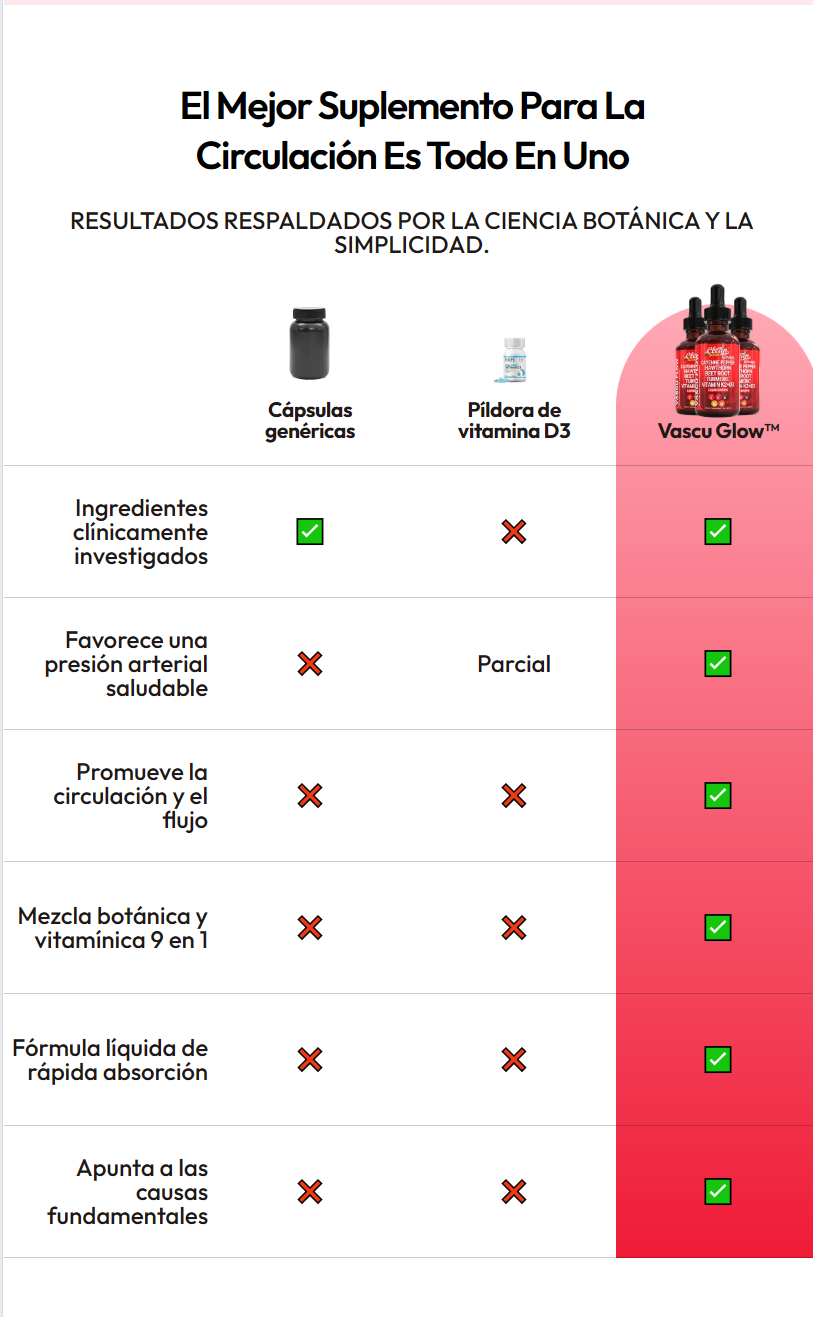 Vascu Glow es un suplemento avanzado formulado para mejorar la circulación sanguínea y la salud vascular. Ayuda a promover un flujo sanguíneo saludable, reduce la sensación de piernas cansadas y apoya la salud cardiovascular general, proporcionando vitalidad y bienestar.